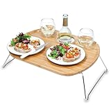 Picnic Time 842-00-505, This picnic time mesamio portable mini bar table features bamboo construction with an open circular section to place a wine bottle down through, and special carved slots that hold two glasses suspended above the surface of your counter or table. A built-in recessed area in the center of the tray provides an area for two plates or your appetizers, or cheese and crackers. Its chrome-plated legs fold flat against the table for easy storage and transport. Bamboo is quite beautiful, and is a sustainable, renewable resource. Wine glasses and plates are not included. Measures 19 by 14-1/2-inch. ...